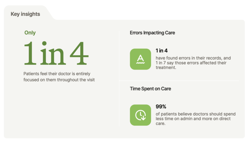 Este enfoque tan cargado en lo administrativo afecta la experiencia del paciente. Simplemente, los pacientes también sienten la ansiedad y la carga de los médicos estresados y quemados. Alrededor de un tercio de los pacientes informaron que los médicos pasaron la mayor parte de su tiempo en la consulta centrados en la pantallas, no en la conversación con ellos. Mientras que en el Reino Unido, hasta una cuarta parte de los encuestados dijeron que habían descubierto errores en sus registros médicos.