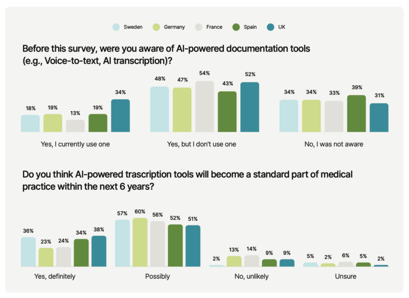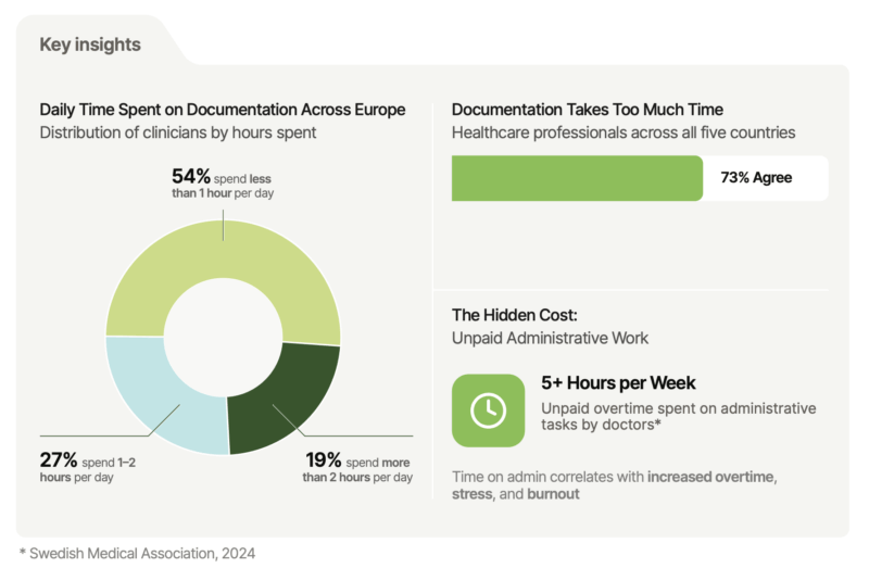 Los hallazgos revelan la escala del problema: los médicos pasan más tiempo en labores administrativas que de atención médica. En todos los mercados encuestados, uno de cada cuatro médicos dedica al menos dos horas al día a la documentación, una cifra aún más alta en Suecia y el Reino Unido. Más del 60% dijo que esto redujo el tiempo para la atención al paciente, y la mitad dijo que dañó la calidad de sus interacciones, con un 39 % reportando un mayor riesgo de agotamiento, con profesionales de la salud españoles y alemanes entre los qué más lo notan.